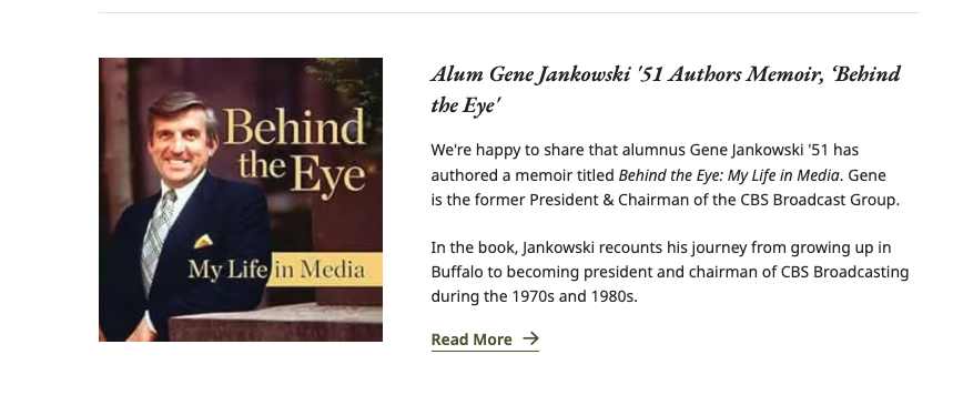 "We're happy to share that alumnus Gene Jankowski '51 has authored a memoir titled Behind the Eye: My Life in Media."